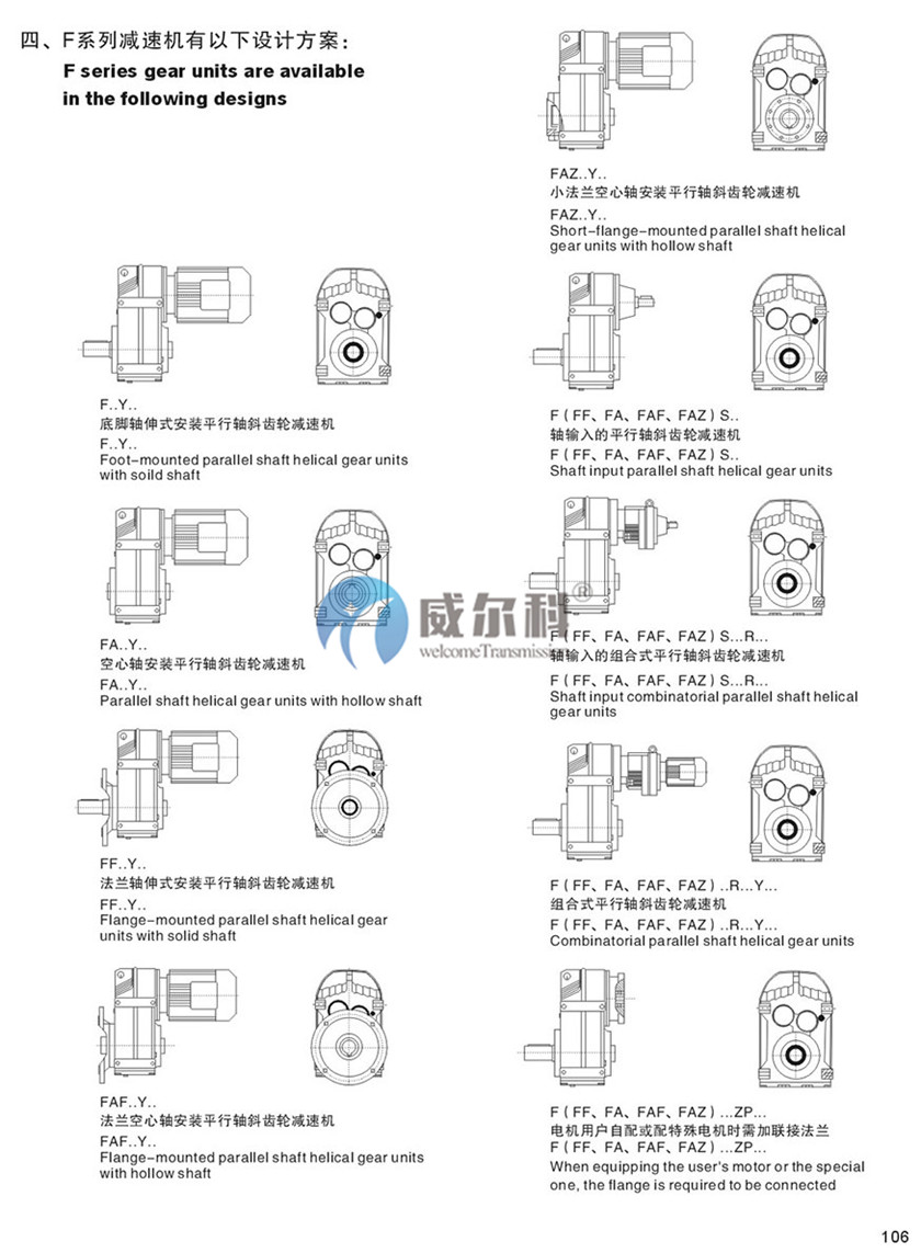F系列平行軸斜齒輪減速機(jī),結(jié)合國(guó)際技術(shù)要求制造 ,具有很高的科技含量,節(jié)省空間,可靠耐用,承受過(guò)載能力高,功率可90KW一上,能耗低,性能優(yōu)越,減速機(jī)效高達(dá)95%以上 ,振動(dòng)小嗓音低,節(jié)能高,選用優(yōu)質(zhì)鍛鋼材料,鋼性鑄鐵箱體,齒輪表面經(jīng)過(guò)高頻熱處理,經(jīng)過(guò)精密加工, 確保軸平行度和定位的精度,這一切構(gòu)成了齒輪傳動(dòng)總成的減速機(jī)配置了各種類電極,形成了電極一體化,完全保證了產(chǎn)品使用質(zhì)量特性