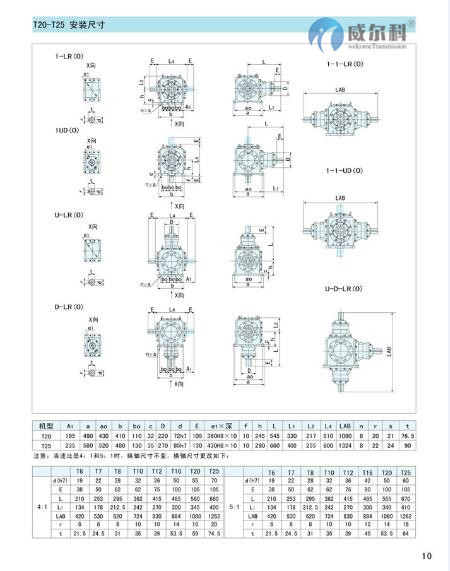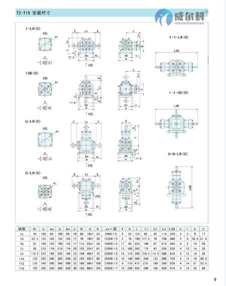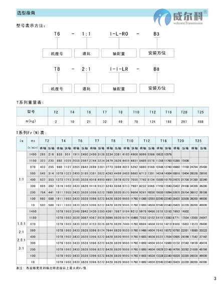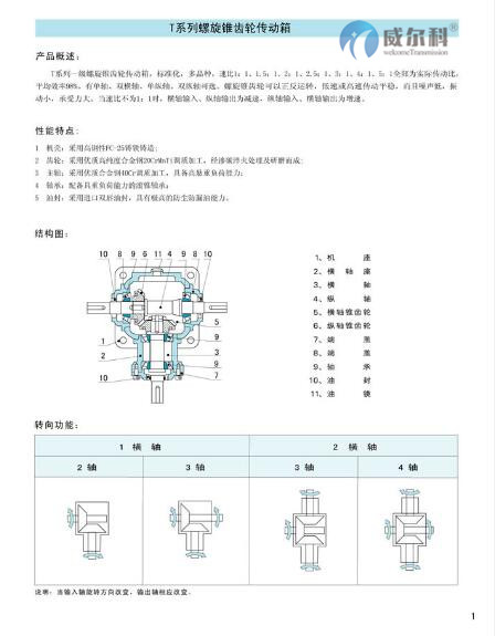 1.T系列螺旋傘齒輪轉向箱,標準化,多品種, 速比全部為實際傳動比。平均效率達98% 。