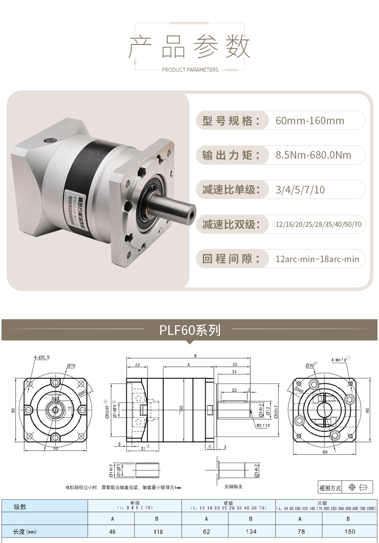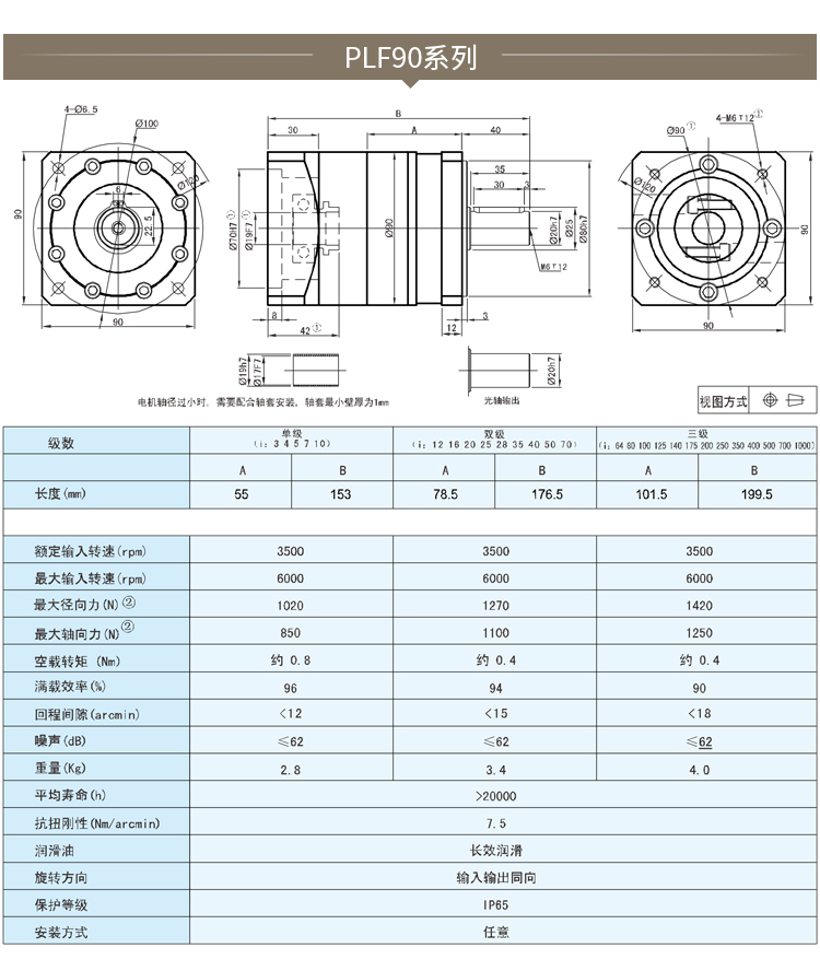 行星減速機(jī)特點(diǎn):產(chǎn)品全面升級,采用前后油封,齒輪配件日本進(jìn)口,國際知名品牌NSK軸承,具有高精度、高鋼性、高負(fù)載、高效率、高速比、高壽命、低慣性、低振動、低噪音、低溫升、外觀美、結(jié)構(gòu)輕小、安裝方便、精確定位等特點(diǎn),適用于交流伺服馬達(dá)、直流伺服馬達(dá)、步進(jìn)馬達(dá)、液壓馬達(dá)的增速與減速傳動。能與任何電機(jī)匹配安裝(如松下,安川,三菱,西門子,富士,臺達(dá),東元,臺安,匯川,信捷,埃斯頓......)電機(jī)不同,與之匹配的尺寸將有所變化,適配器將不同,配特殊電機(jī)可以訂做!!